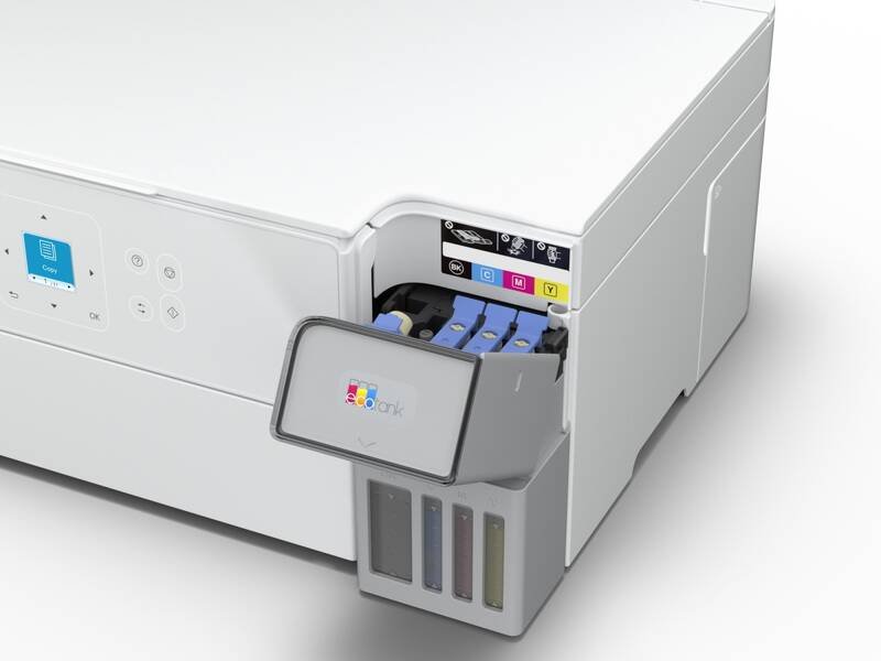 Tiskárna využívá integrované inkoustové nádržky místo klasických kazet. Každá barva má vlastní plnicí otvor se zabezpečením proti záměně, takže doplňování je jednoduché a bezpečné. Výsledkem je výrazně levnější tisk a méně plastového odpadu.