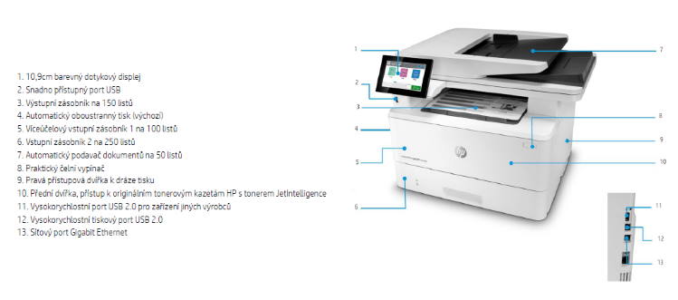 Tiskárna kontroluje odchozí síťová připojení, aby zastavila podezřelé požadavky a využití malwaru. Svá uložená data v tiskárně můžete ochránit pomocí integrovaného příslušenství HP Trusted Platform Module. Jako volitelné příslušenství lze zvolit bezdrátová připjení Wi-Fi, Bluetooth i NFC, nebo čtečku HP Legic Secure USB a také další podavač/zásobník na 550 listů papíru.Specifikace