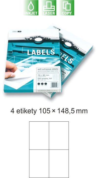 4 etikety 105 x 148,5 mm, balení obsahuje 100 listů formátu A4.